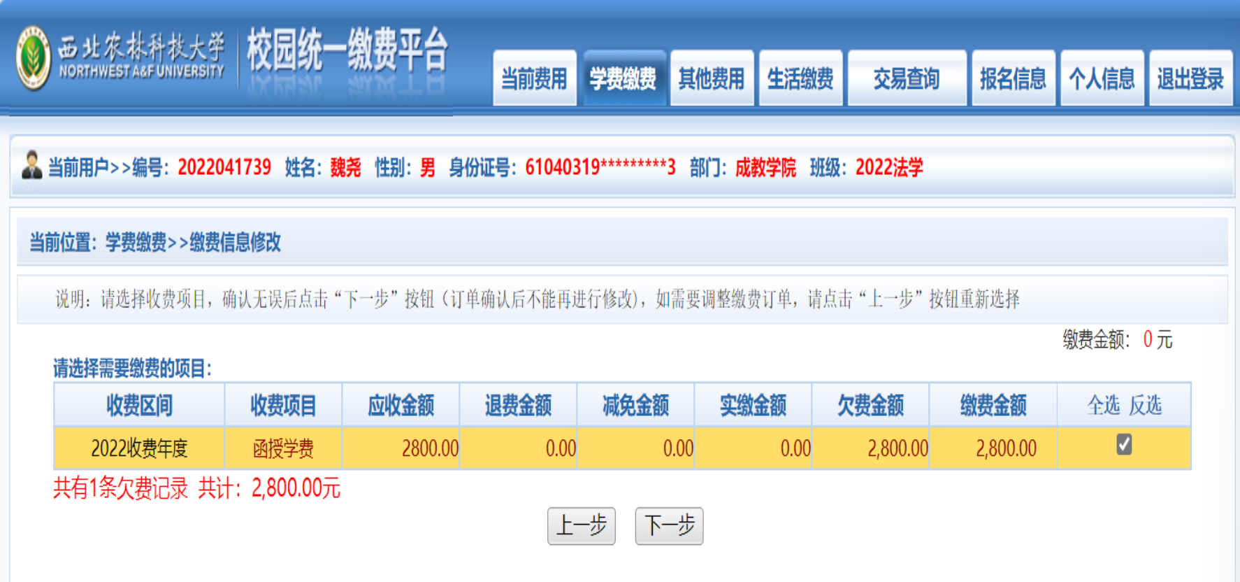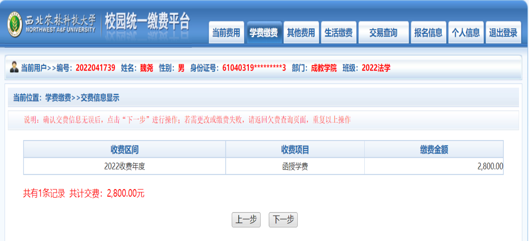 5、确定缴费信息无误后,点击下一步。