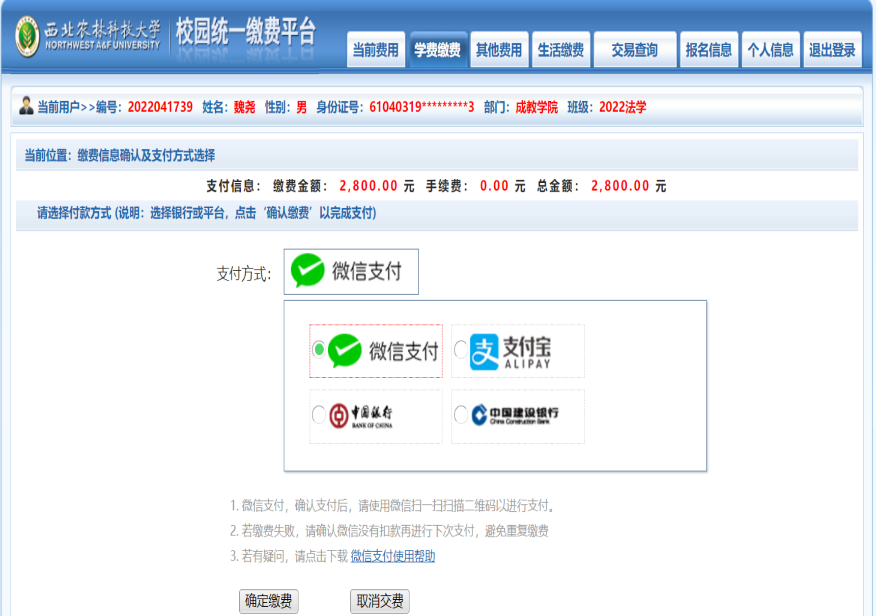 6、选择支付方式(暂可选择支付宝或者微信支付),确定缴费。