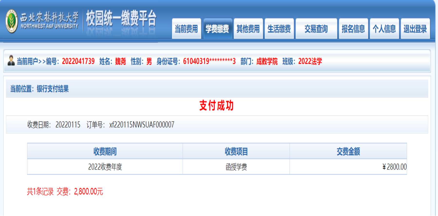7、缴费成功,保存支付成功页面(截图发至教学点老师)