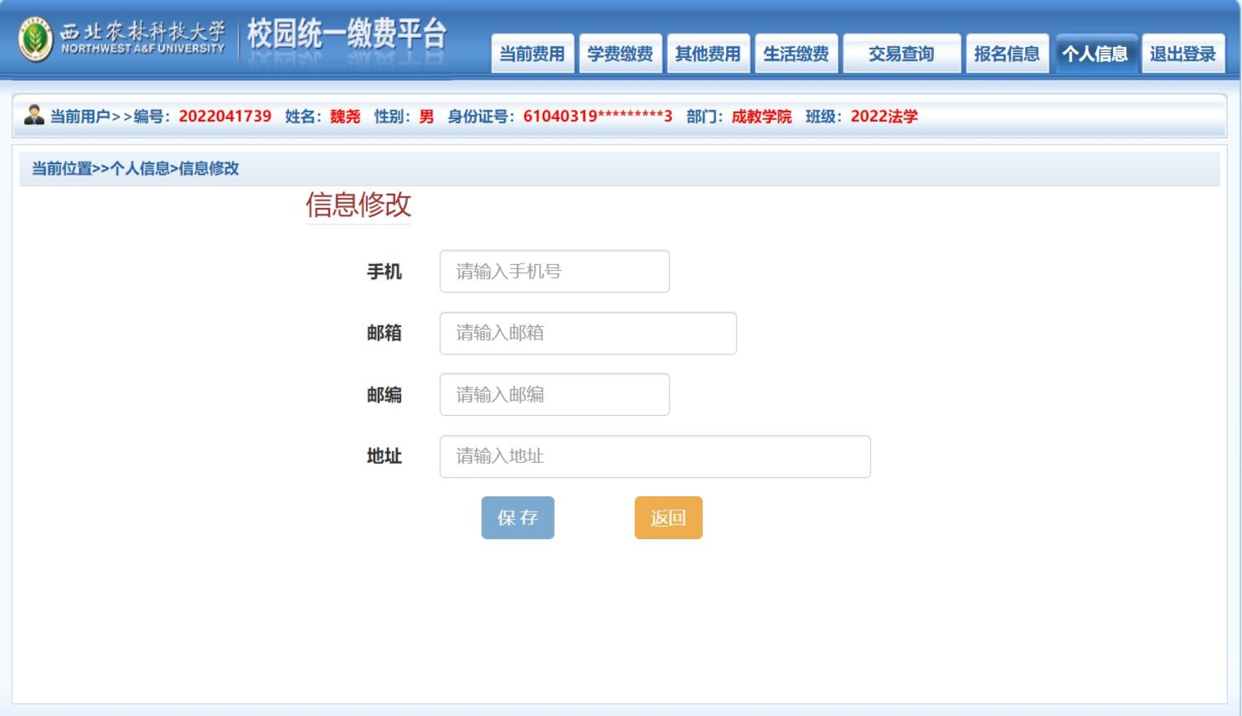 2、点击个人信息进行完善,并保存。