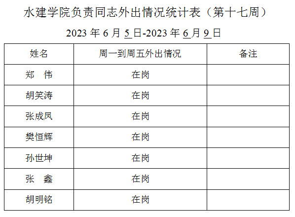 杏吧探花 负责同志外出情况统计表(第十七周)