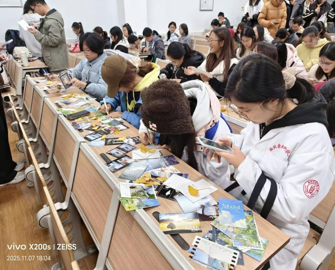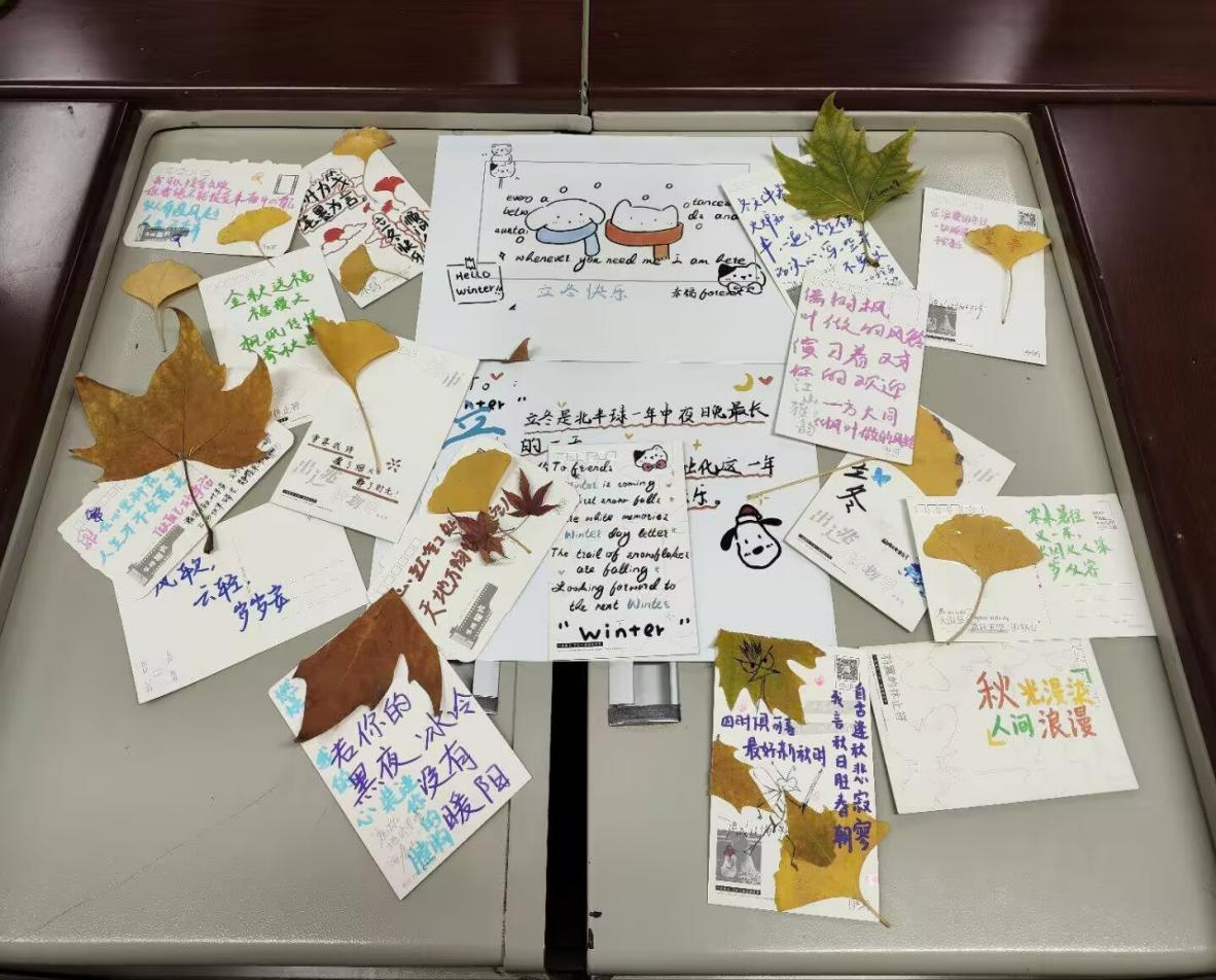 活动旨在以节气为纽带,让同学们在实践中感受传统文化魅力,用创意传递冬日温情。活动现场暖意融融,空白明信片、各色落叶、彩笔等材料整齐摆放。同学们充分发挥创意,用落叶拼贴出冬日图景,用彩笔书写暖心寄语,在方寸卡片间勾勒冬日诗意。大家相互交流灵感,现场氛围温馨和睦。