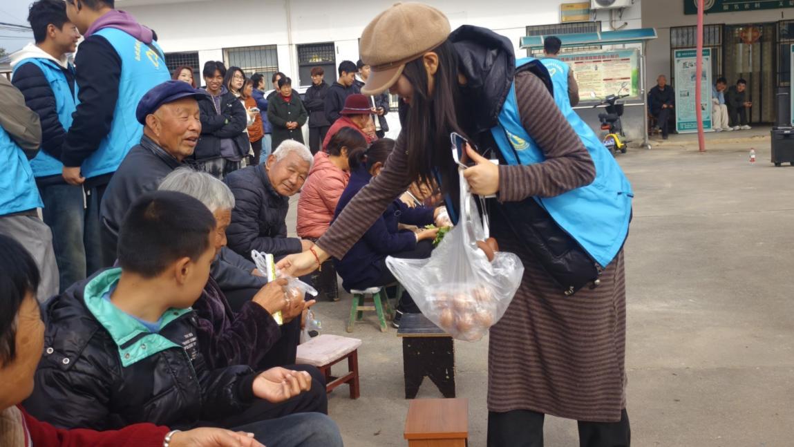 表演结束后,志愿者们为老人们分发鸡蛋及同学们亲手制作的围巾、折纸、剪纸与桌面摆件等礼物,每一份礼物都承载着学子们的感恩之心,现场洋溢着欢愉与团圆的温暖。