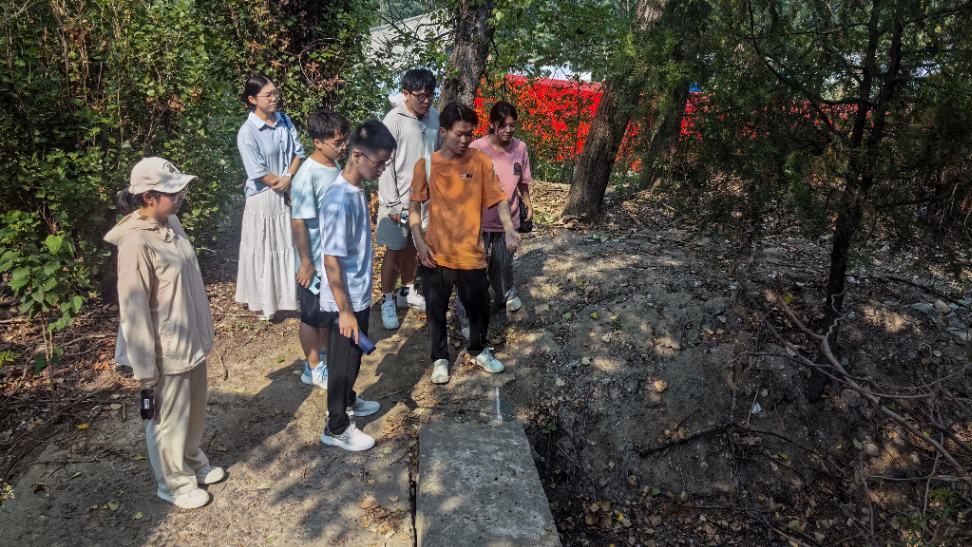 图为参观漳南大渠的现场,队员在讨论相关水利知识