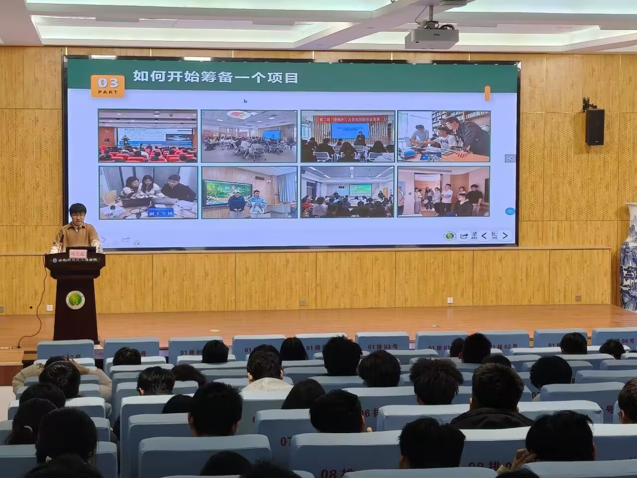培训开始前,参会学生有序签到入场,现场气氛热烈。周立志围绕“互联网+”“挑战杯”等主流赛事,结合水利与土木学科特色,系统讲解了项目选题、计划书撰写、现场答辩等关键环节。针对国家奖学金评定中“学科竞赛获国家级一等奖及以上可申请破格资格”的政策,周老师重点解析了水利类项目的备赛要点,并通过往届获奖案例,深入阐释如何将节水灌溉、智慧水利等专业方向与赛事创新要求紧密结合。
