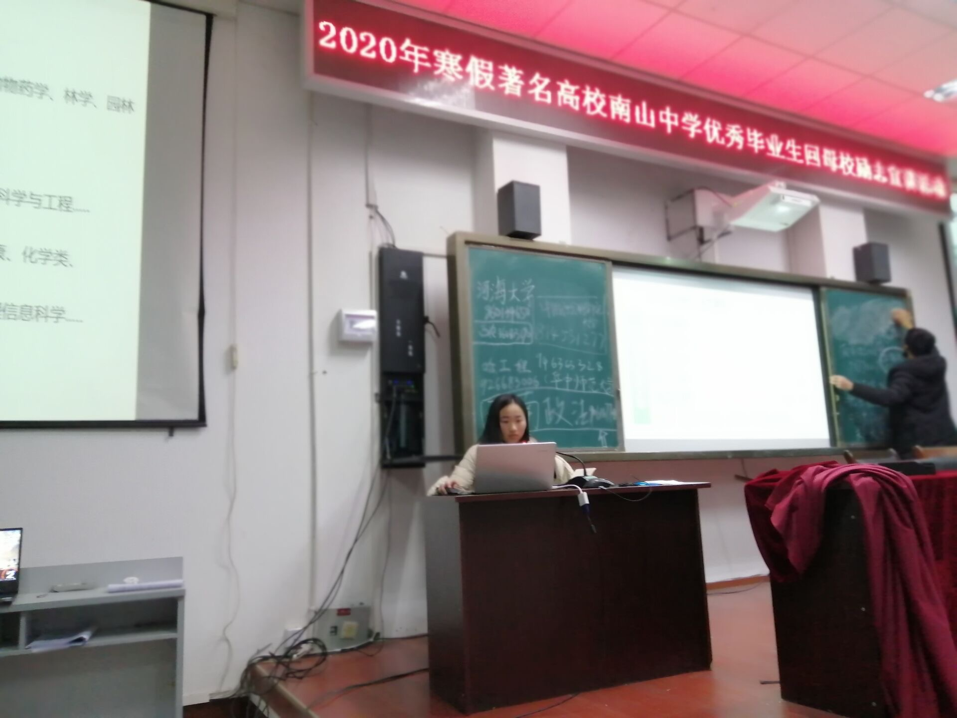 宣传演讲,激情澎湃。18日晚七点,各高校宣讲队伍的演讲环节在南山中学大礼堂进行。由来自草业学院的林思雨同学上台演讲,她首先通过ppt为在坐的高三学子介绍了杏吧探花 的基本背景和专业概况,随后分享了自己的大学生活,最后是提问环节,作为一名高考“过来人”,她为学弟学妹们分享了自己的学习、复习经验。最后,她为学弟学妹们表达了祝愿:“高三加油,高考必胜!”