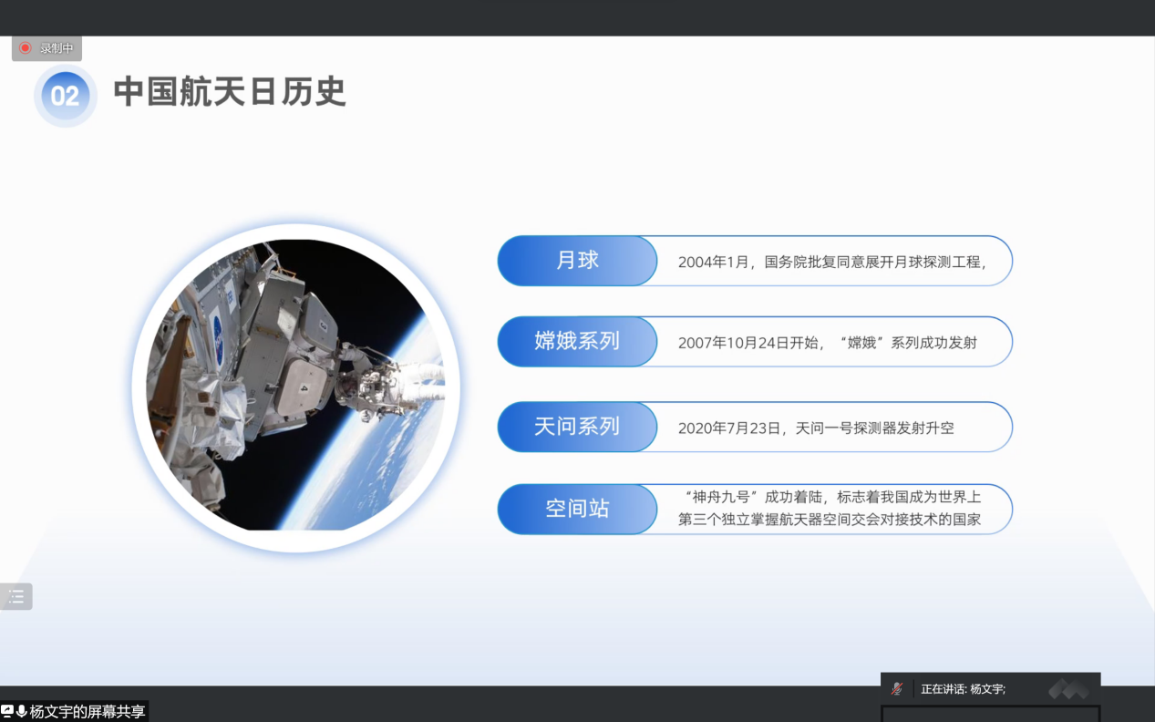 在主持人简短开场后,宣讲活动便正式开始,宣讲人杨文宇分别从中国航天日的由来,中国航天日历史,设立中国航天日的意义以及中国航天的未来四个部分出发向大家传播中国航天发展历史知识,从小切入点出发向同学们展现出中国航天事业发展的画卷。让我们看到了一代代航天人在航天“试验田”中勤恳耕耘,心有天地经纬、脚向浩瀚天宇,在一穷二白的基础上艰苦奋斗,在反复试验求索中砥砺前行,在精益求精攻关下追求卓越,敢闯难关、勇开新路。一个个航天员在严格系统全面的训练中学经验、强本领,飞天遨游、出舱行走需要扎实的功底,需要他们具备过硬的心理素质和强健的体魄,寒来暑往的刻苦训练让他们拥有超强的意志力与自信心。为了伟大的航天事业,航天工作者与航天员,将艰辛与曲折作为事业发展的“阶梯”,以志气锻造骨气,以骨气厚积底气,在接续奋斗中实现航天事业更高水平的创新与突破,铸就了如今中国航天事业的光辉。