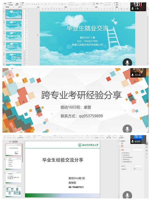 会议伊始,康蕾从要不要跨考、目标院校的选择、初试复习要点、复试以及对同学们的叮嘱等五个方面介绍了自己的考研经验。她希望同学们如果跨考是出于对于另一个专业的热爱,选择目标院校可以结合自身条件、学校所在城市和专业发展情况进行考量,初试时数学和英语一点定要从始至终地练习以打好基础,复试切不可忽视。她告诉同学们种一颗树最好的时间是十年前,其次是现在。随后,赵旭征介绍了申请需要的条件、各阶段的任务和疫情下的留学等方面的留学经验。他建议同学们大一时考取四六级并开始准备雅思,大二积极参加学术竞赛和会议,大三考取雅思并积极参加实习,这些都可以为留学申请加分。最后,卜康就简历制作、搜集公司信息、参加宣讲会以及笔试和面试等方面给同学们分享了他的求职经验。简历方面他叮嘱同学们要准备多份简历,有针对性而且要注意细节、格式和篇幅;在搜集公司信息方面他介绍了中电、水电站、水利设计院以及勘测院等就业去向,告诉同学们要综合考虑薪酬、工作地点和性质;他建议同学们多参加宣讲会,积累面试经验,每年的9-10月的宣讲会以及10月中旬的双选会企业比较多、质量好。他希望同学们坚持自己的目标和理想,努力去实现它们!