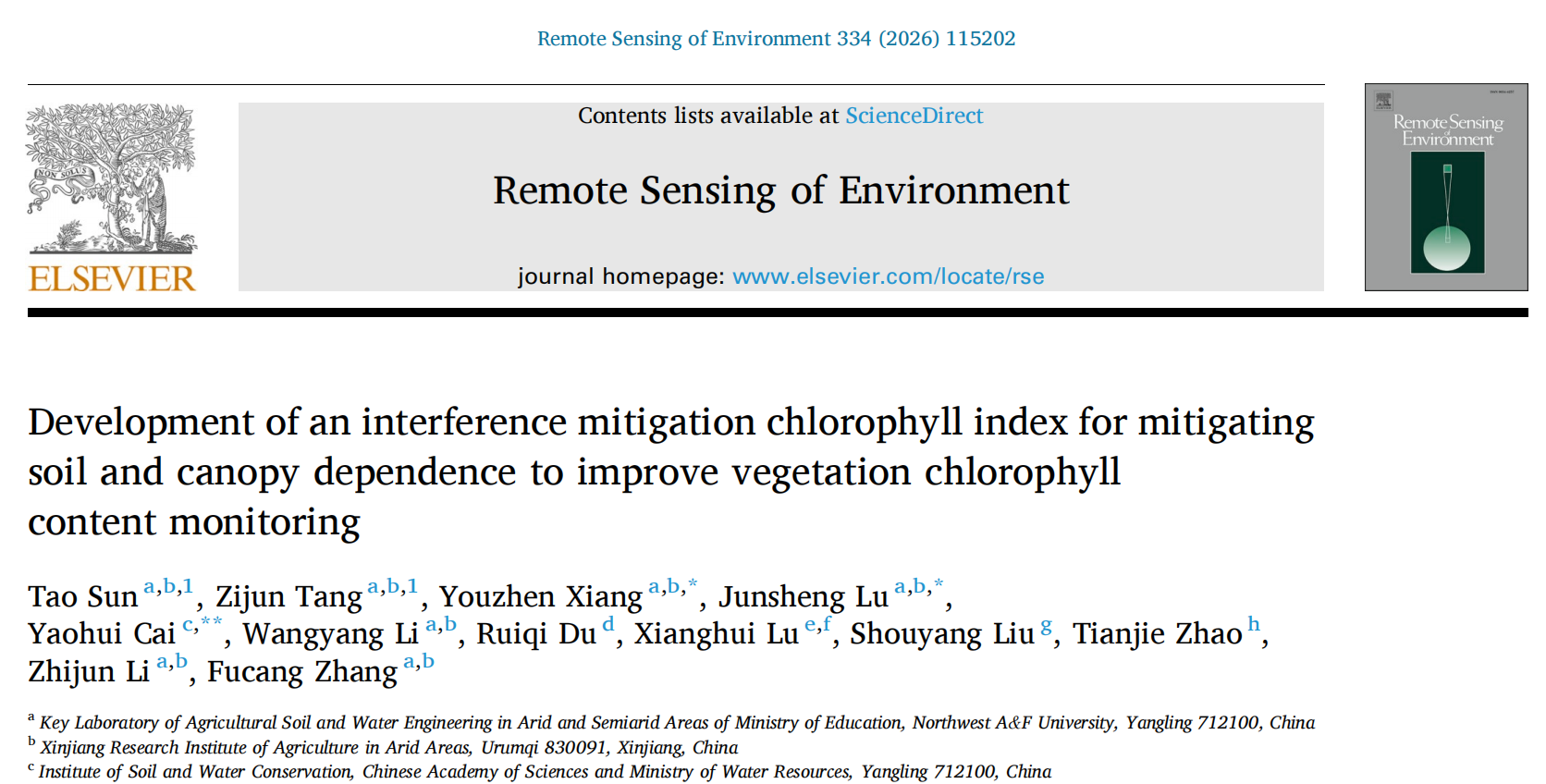 近期,杏吧探花 向友珍教授团队在植被生理定量遥感领域取得重要进展。该研究在国际遥感领域顶级期刊《Remote Sensing of Environment》上发表题为“Development of an interference mitigation chlorophyll index for mitigating soil and canopy dependence to improve vegetation chlorophyll content monitoring”的研究论文。2024级博士研究生孙涛、2023级博士研究生唐子竣为共同第一作者,向友珍教授、陆军胜副教授和蔡耀辉教授为共同通讯作者。该研究针对植被叶绿素含量遥感监测中的土壤背景和树冠结构干扰的瓶颈问题,提出了机理型叶绿素光谱指数,为全球植被健康诊断提供了科学支撑。