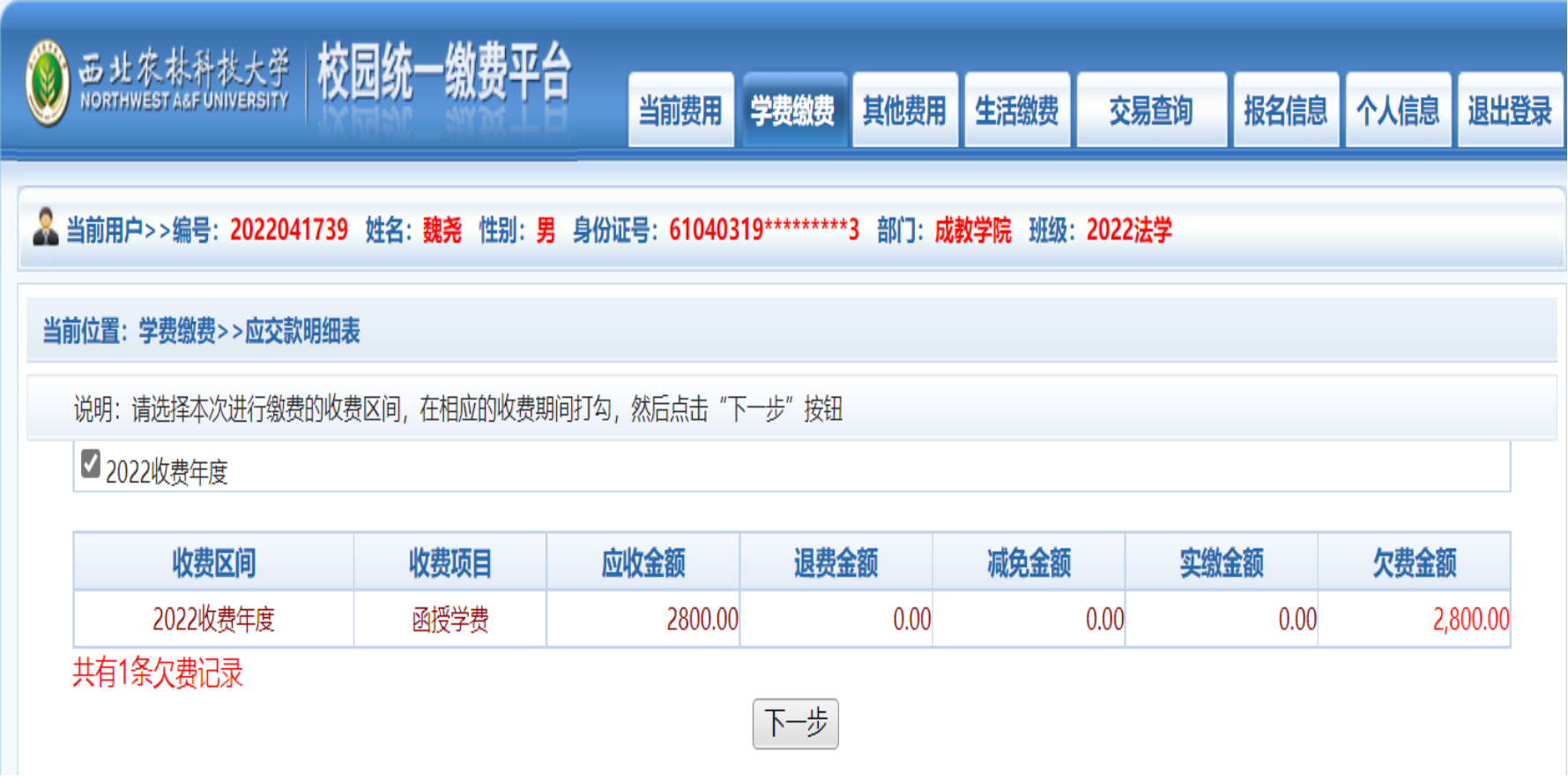 5、确定缴费信息无误后,点击下一步。