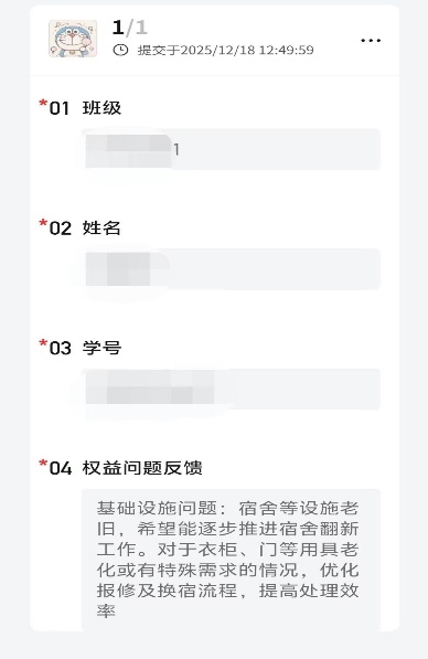 本次活动旨在搭建学生与学院之间的沟通桥梁,聚焦同学们在校园生活中遇到的各类实际问题,共同营造更舒适、便利的学习与生活环境。通道开启后,同学们积极响应,通过反馈通道提出了许多具体而真实的诉求。反馈内容涵盖宿舍生活、校园设施、生活服务等多个方面。集中体现了同学们对提升校园日常学习生活水平的期待。